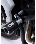 Crash pady CSP do Triumph Trident 660 zabezpieczają silnik i ramę podczas kolizji. Zestaw mocowany jest do motocykla przy pomocy dwóch śrub, dzięki czemu mniejsza siła jest przenoszona na elementy konstrukcyjne motocykla podczas uderzenia. W ofercie również crash pady przedniego zawieszenia oraz wahacza, które stanowią uzupełnienie crash padów podstawowych.